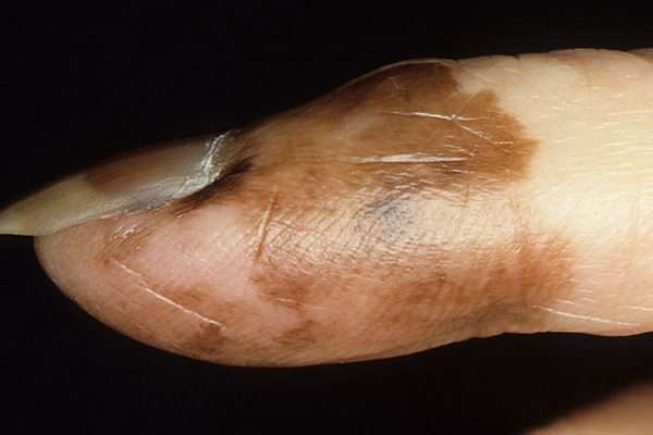 Если на пальце руки или ноги появилось темное пятно или полоса черного цвета, которое имеет неравномерный окрас (темное внутри, светлее по периферии), необходимо немедленно обращаться за помощью к врачу-дерматологу.